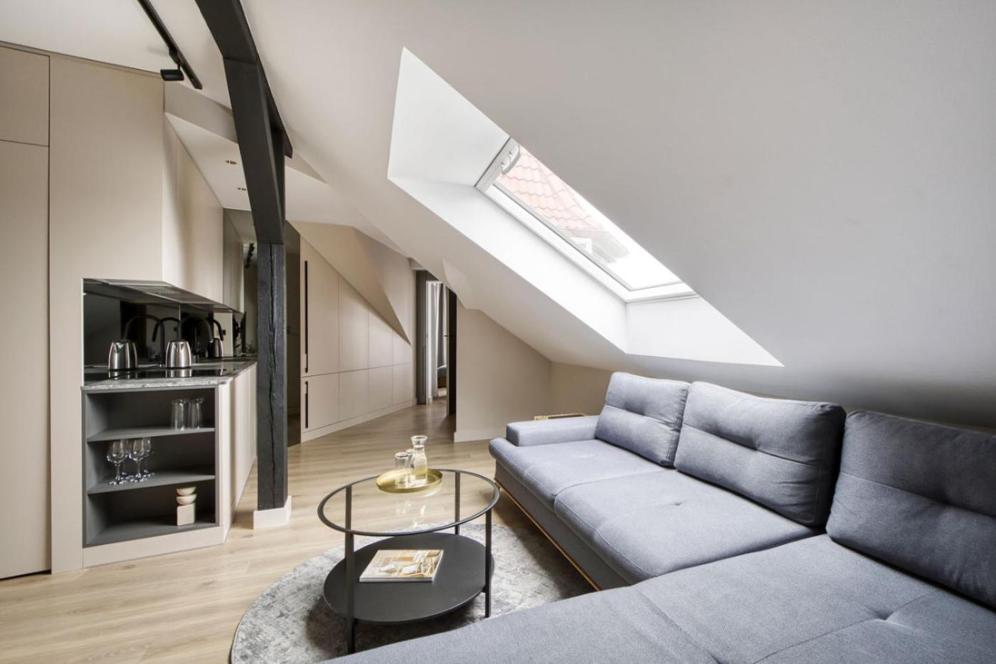 Apartament z tarasem. Ten apartament mieści salon, oddzielną sypialnię oraz łazienkę z prysznicem i bezpłatnymi przyborami toaletowymi. W dobrze wyposażonej kuchni zapewniono płytę kuchenną, lodówkę, przybory kuchenne oraz czajnik elektryczny. W apartamencie znajduje się pralka oraz telewizor z płaskim ekranem i dostępem do kanałów satelitarnych. Z tarasu roztacza się widok na miasto. W tej opcji zakwaterowania są dostępne 2 łóżka. Apartament - 4 osobowy. Powierzchnia pokoju ok.: 50 mkw. ;