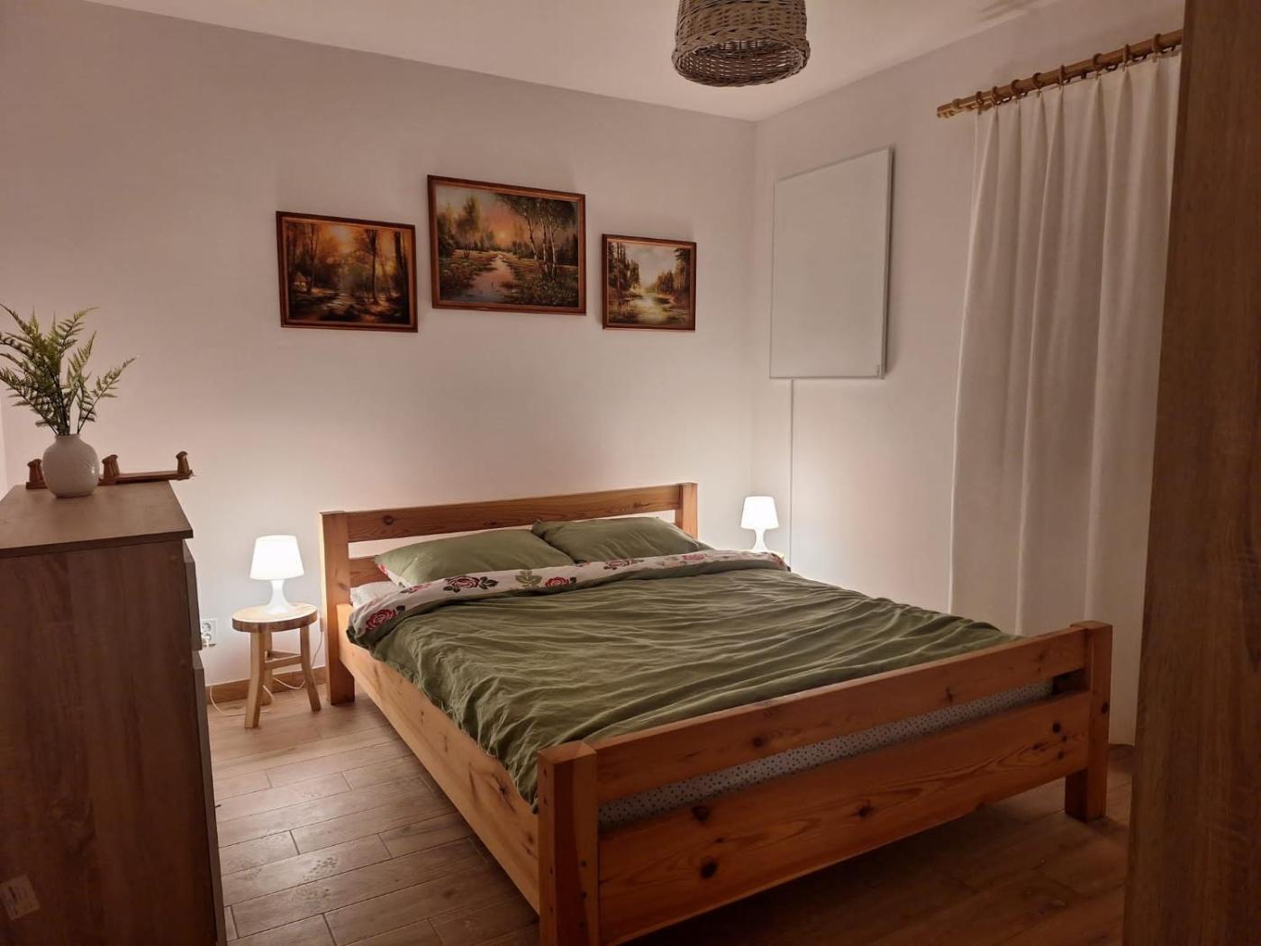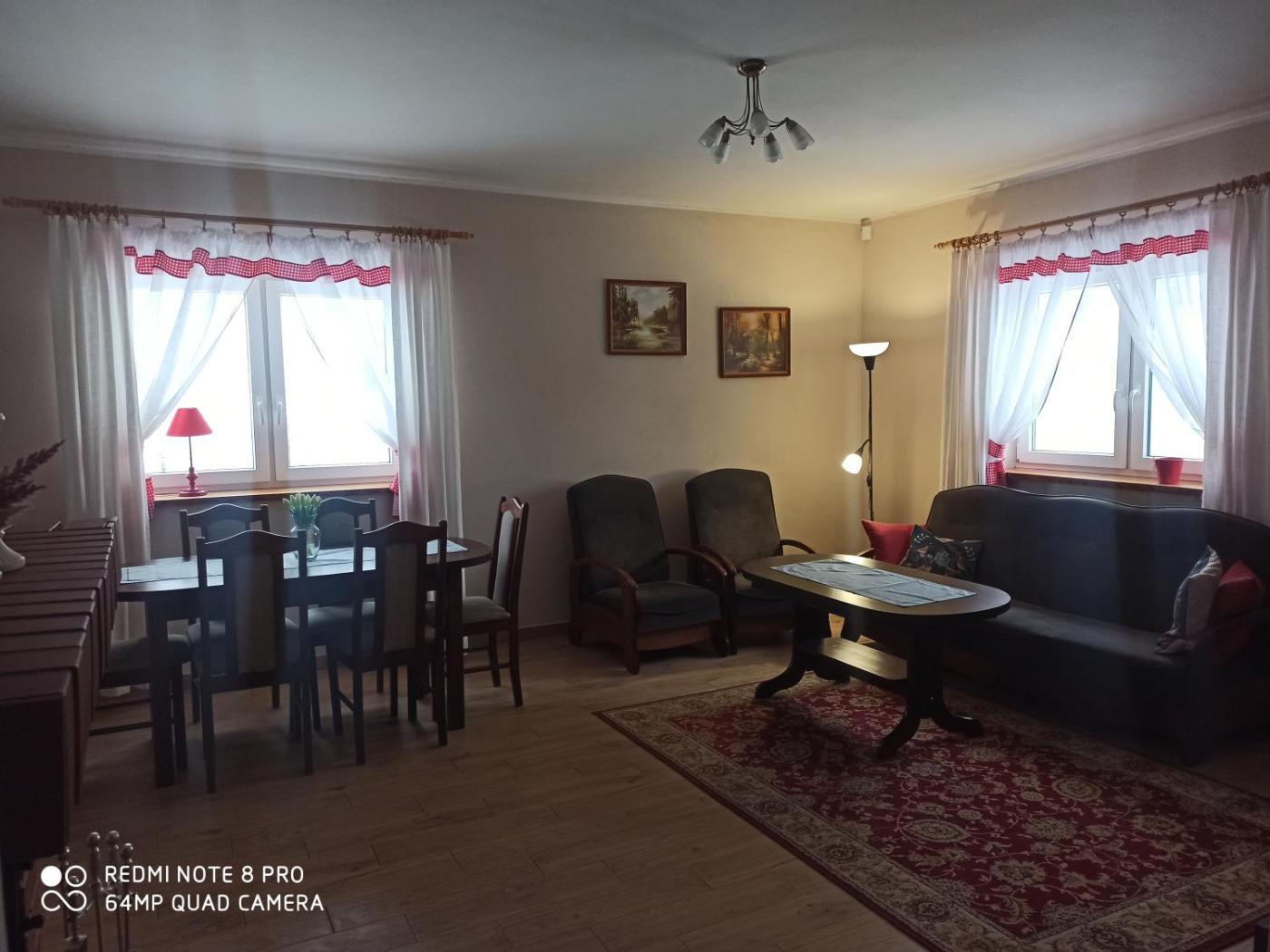 Dom z 2 sypialniami. The fireplace is a top feature of this holiday home. Guests will find a stovetop, a refrigerator, kitchenware and an oven in the well-equipped kitchen. The holiday home also includes a barbecue. Boasting a terrace with garden views, this holiday home also features a washing machine and a flat-screen TV. The unit has 4 beds. Dom wakacyjny - 6 osobowy. Powierzchnia pokoju ok.: 90 mkw.