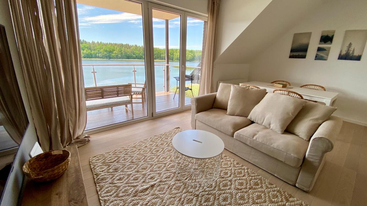 Apartament z widokiem na jezioro. Ten przestronny apartament mieści salon, 2 oddzielne sypialnie oraz łazienkę z wanną i bezpłatnym zestawem kosmetyków. W doskonale wyposażonej kuchni przygotowano płytę kuchenną, lodówkę, zmywarkę do naczyń i przybory kuchenne. Goście mają też do dyspozycji sprzęt do grillowania. Pozostałe udogodnienia obejmują oddzielne wejście, dźwiękoszczelne ściany, pralkę oraz telewizor z płaskim ekranem i dostępem do serwisów streamingowych. Z apartamentu roztacza się widok na jezioro. W tej opcji zakwaterowania znajdują się 3 łóżka. Apartament - 6 osobowy. Powierzchnia pokoju ok.: 70 mkw.